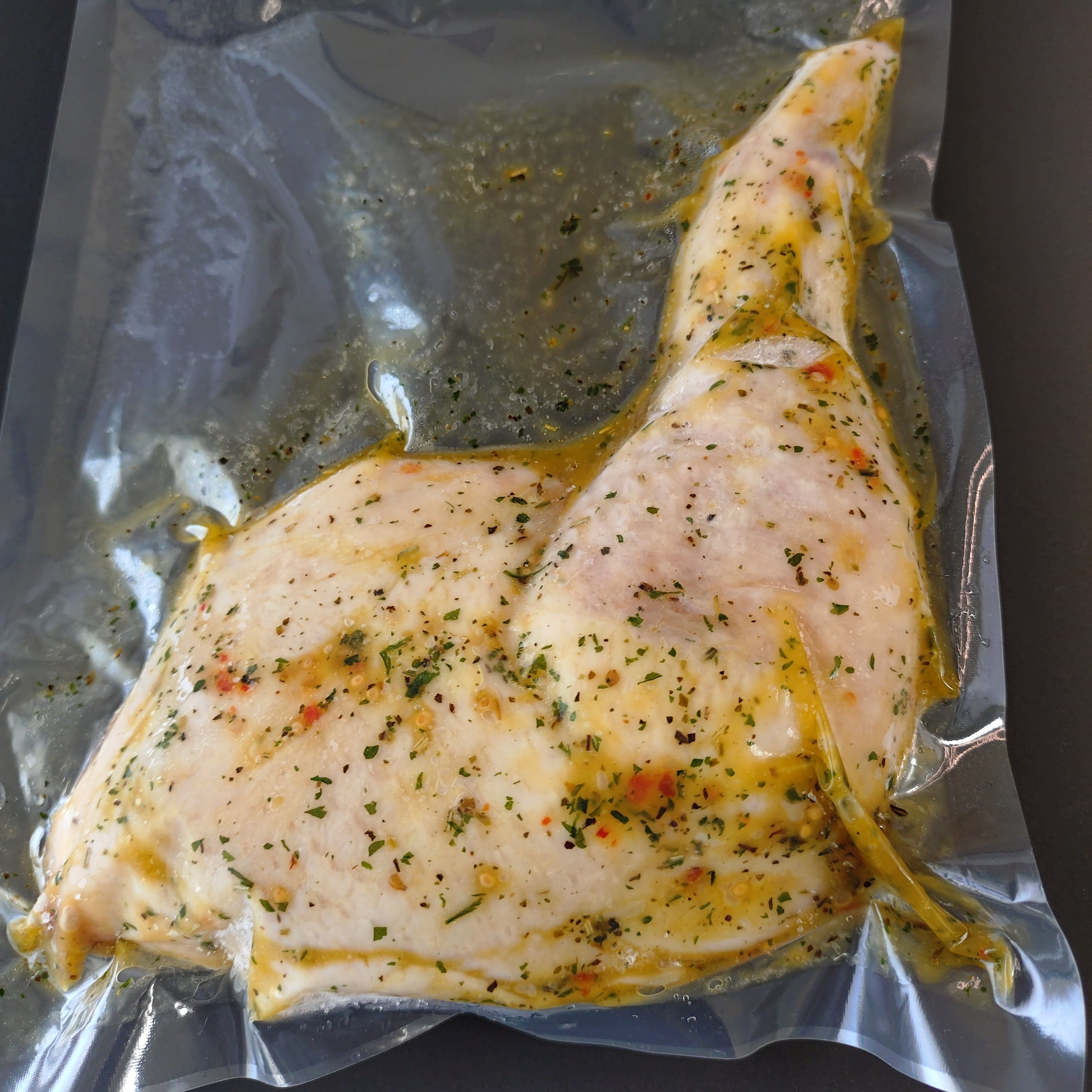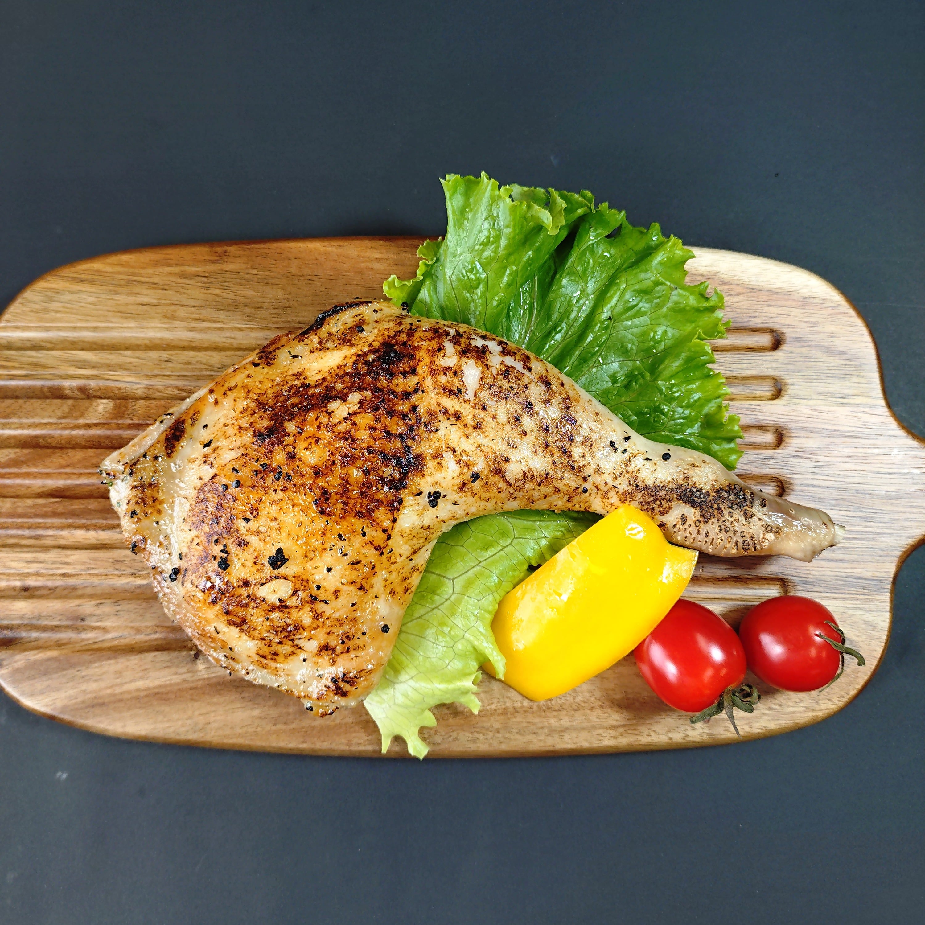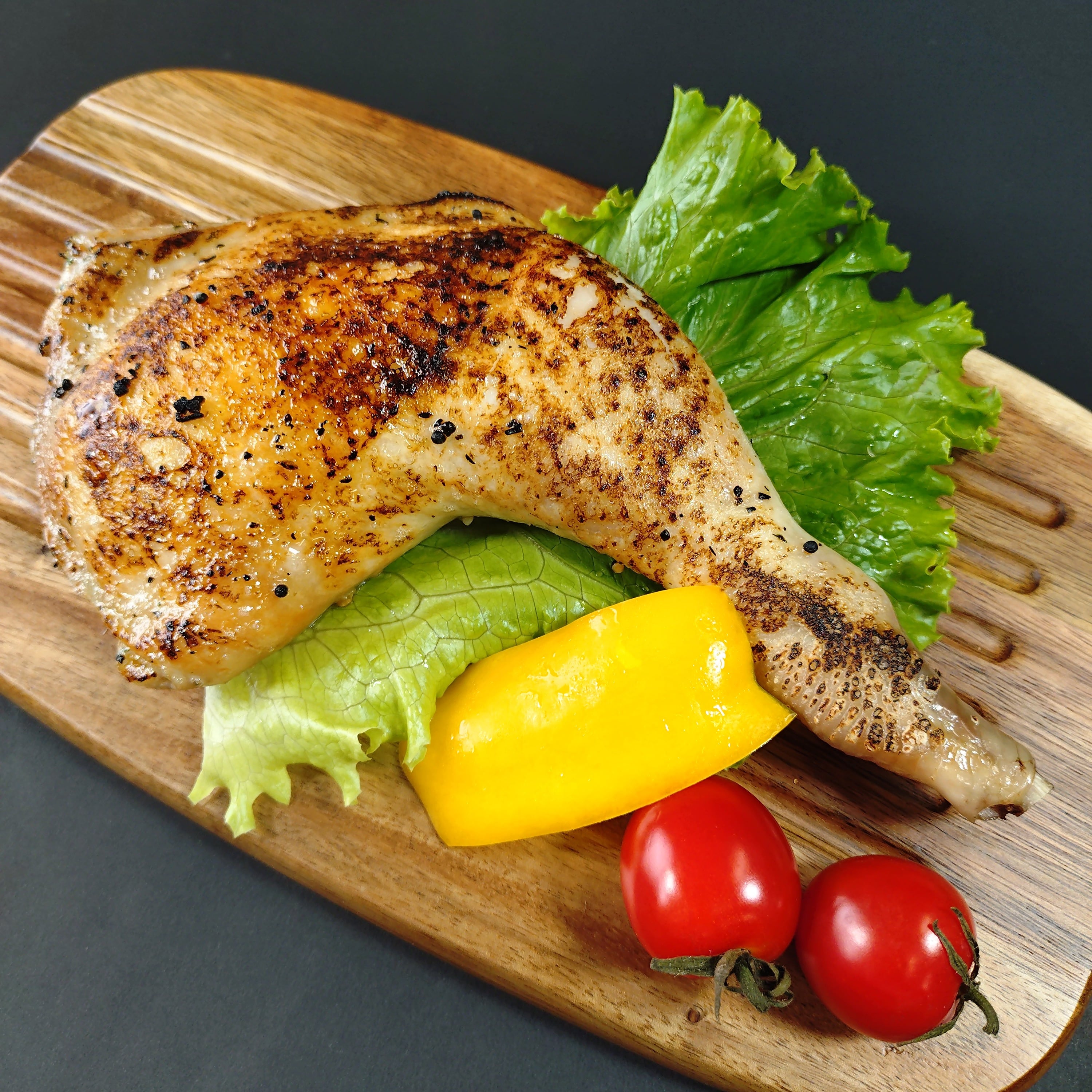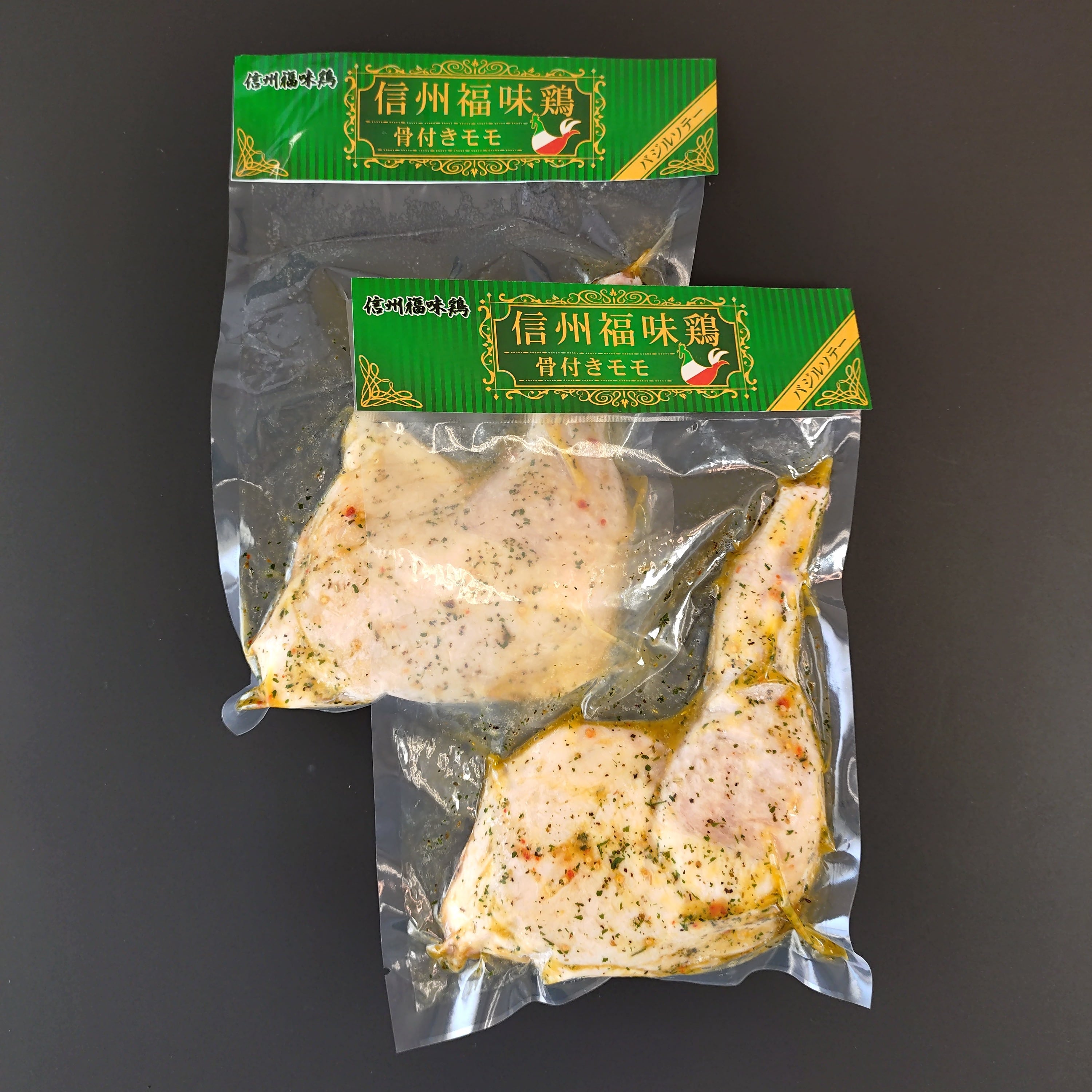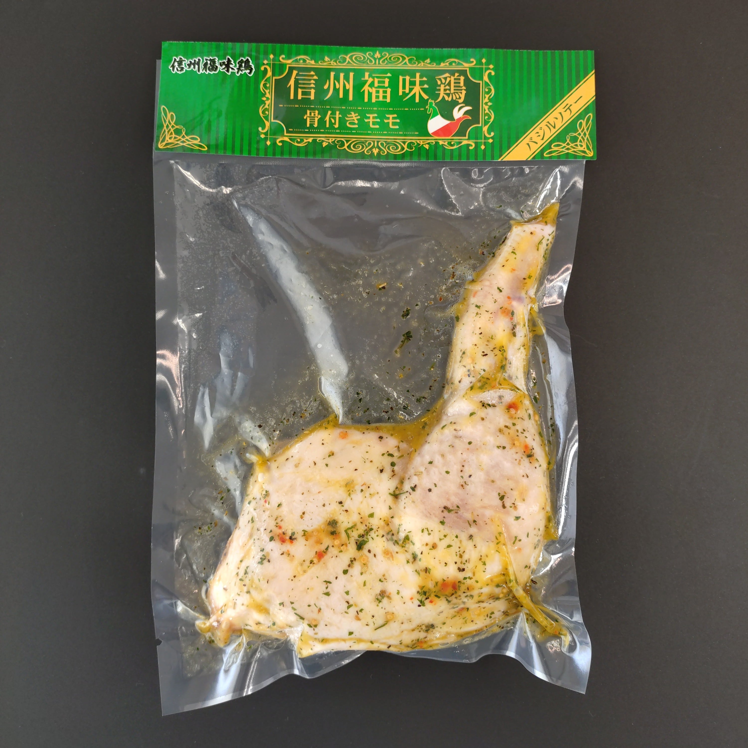 信州のブランド鶏肉「信州福味鶏」の旨みがぎゅっと詰まったジューシーな骨付きモモを、特製バジルソースに漬けこみました。
